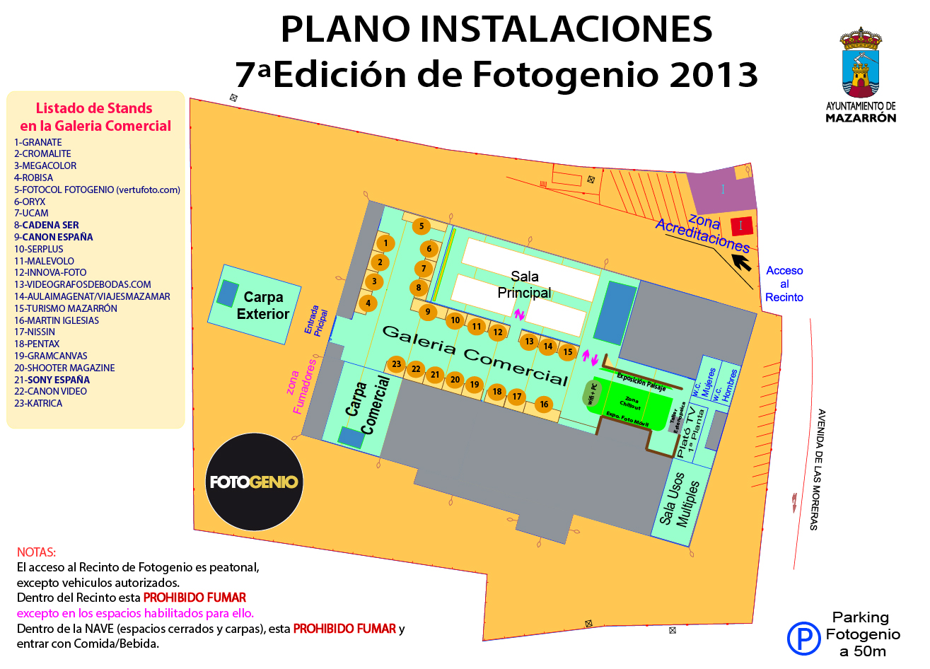 Este es el plano de distribuci�n de las instalaciones donde se celebra el encuentro. Se trata de la Nave Paloma, a la entrada del núcleo urbano de Mazarrón, por la Avenida de Las Moreras. La nave cuenta con una superficie de 6.000m2 y está dentro de una parcela vallada y asfaltada de 16.000m2. Contamos con una zona de parking acotada justo enfrente de la nave. Pulsa sobre el plano para ampliarlo.